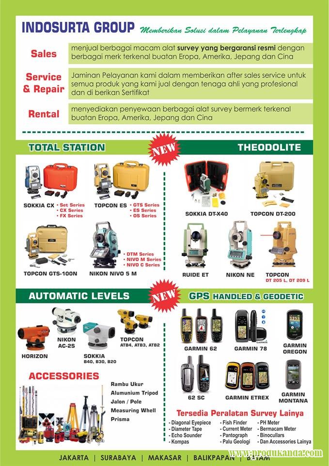 PT. Alat Ukur Indosurta bergerak di bidang penjualan, penyewaan dan service kalibrasi alat-alat survey. Kami hadir lebih luas dan lebih dekat untuk melayani kebutuhan pengukuran anda di bidang konstruksi, telekomunikasi, kehutanan, pertambangan, kelautan, dll.